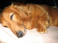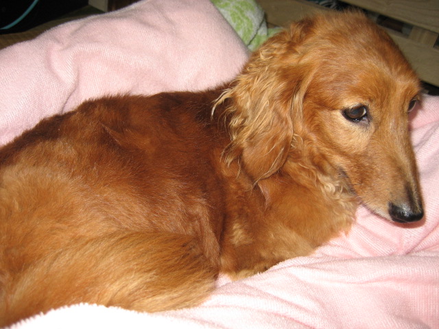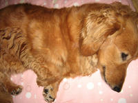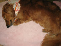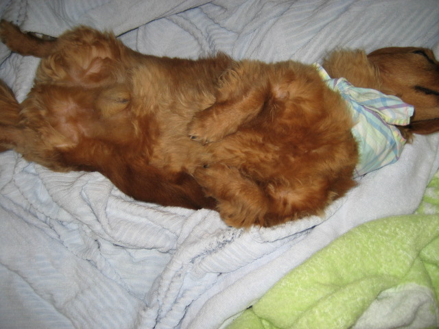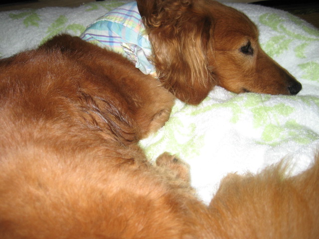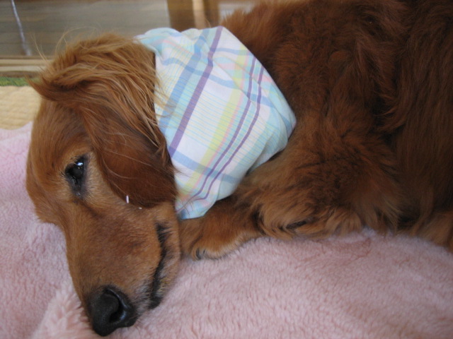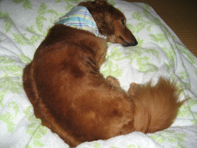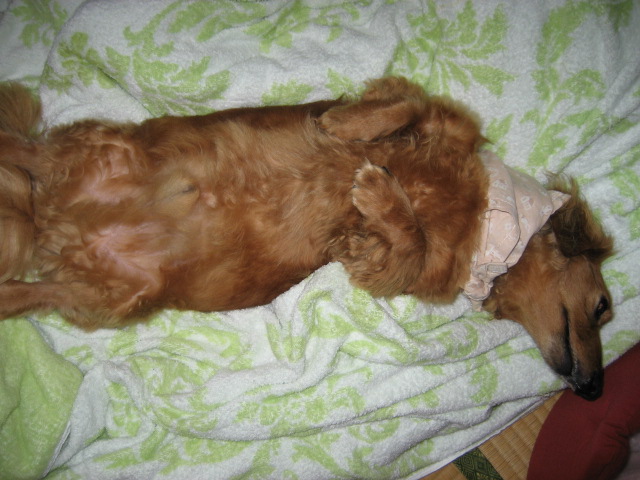 家ではこんな感じ~。保冷材を巻いて、寝てます。